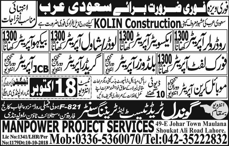CONSTRUCTION JOB FOR SAUDI ARABIA 18-10-2018