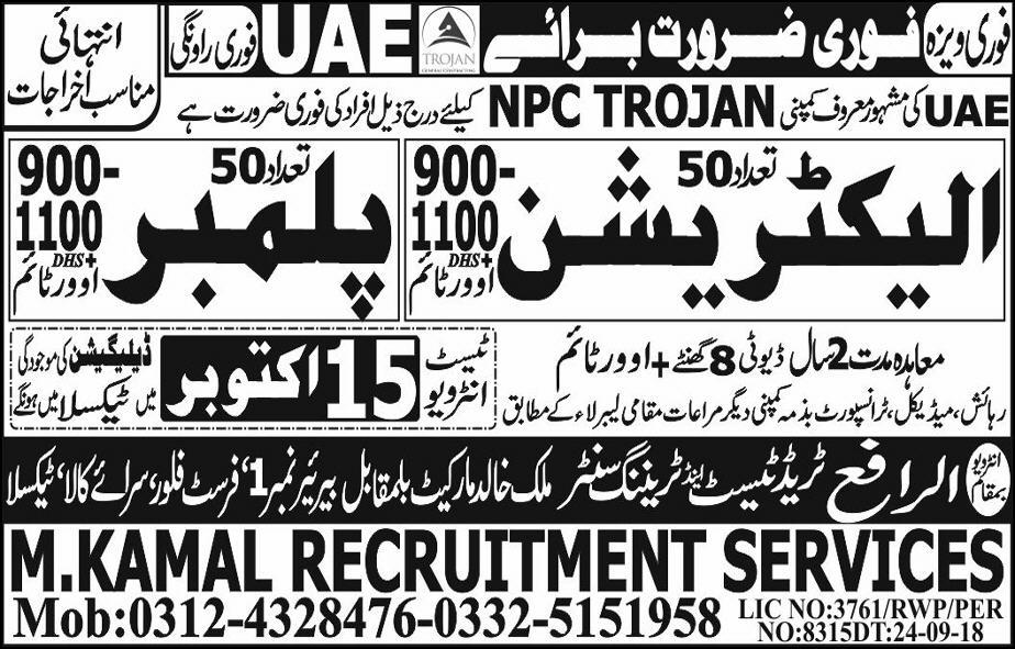 فوری ضرورت براۓ( یو یے ای ) JOB FOR UAE 12-10-2018